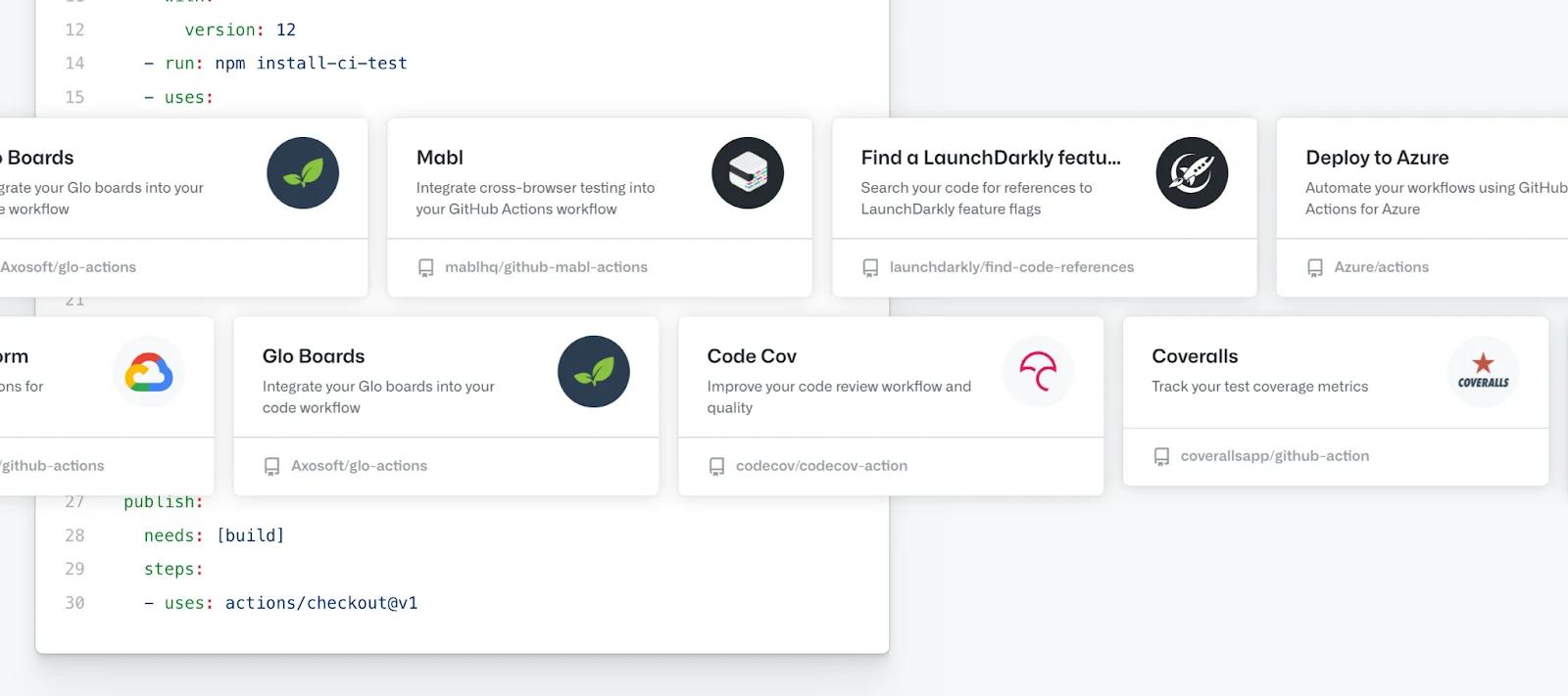 The actions displayed are integrations from third-party software to improve code reviews, automate specific actions, and improve other intricate development tasks. The sliding carousel captures user attention, convincing them to take action like in the name of the GitHub product launch.