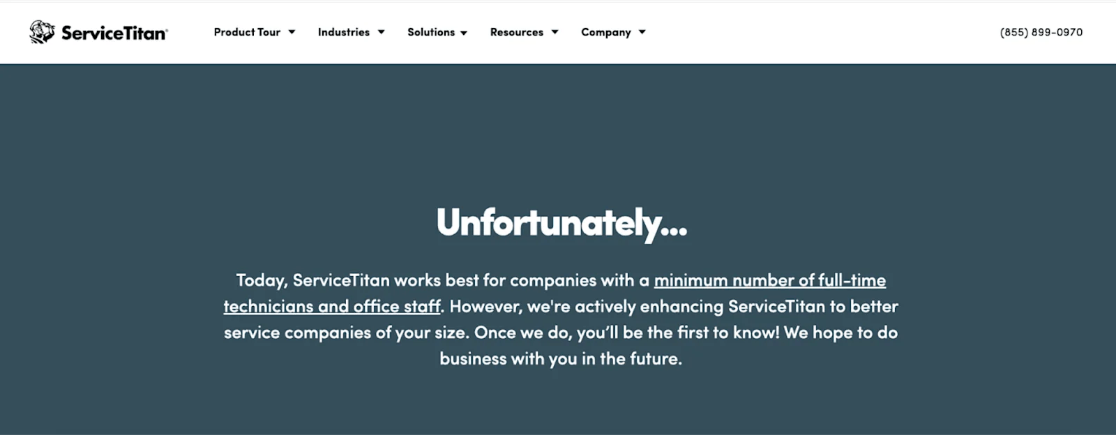 For companies that don't meet ServiceTitan's customer profile, they are redirected to a page that displays a message explaining why your company might not qualify for using its services.