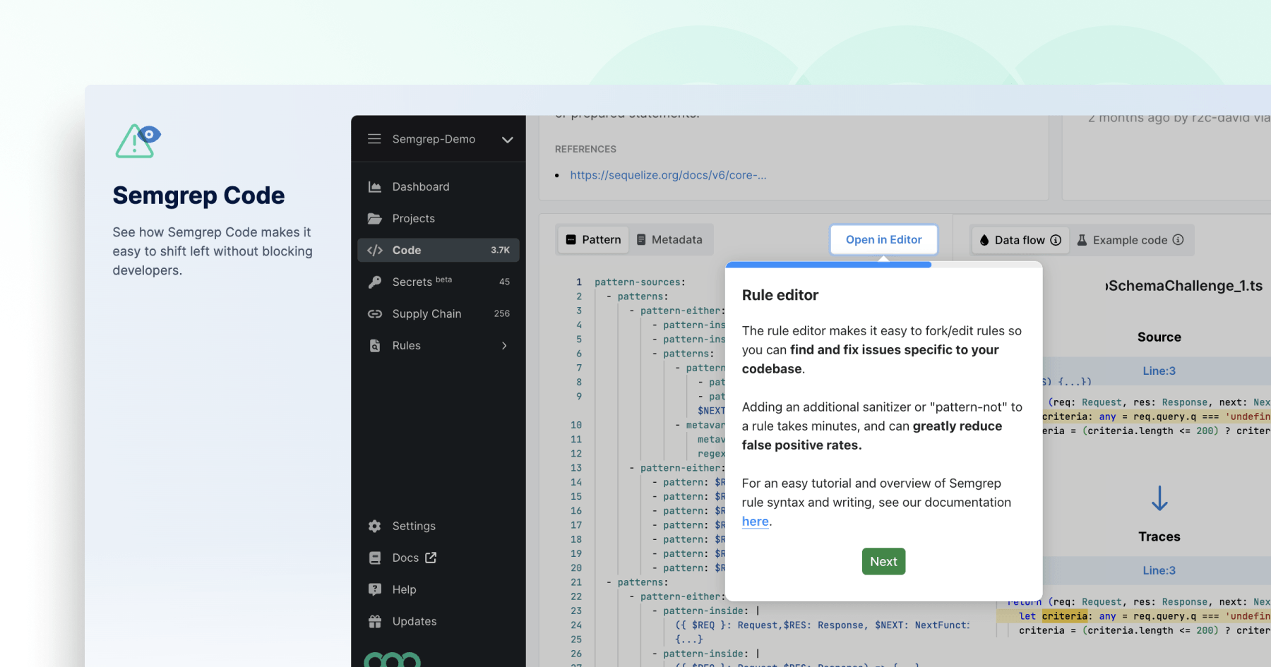 Webstacks also designed and developed a page that hosted interactive demos, giving users a step-by-step walkthrough of Semgrep’s “Code” and “Supply Chain” products.