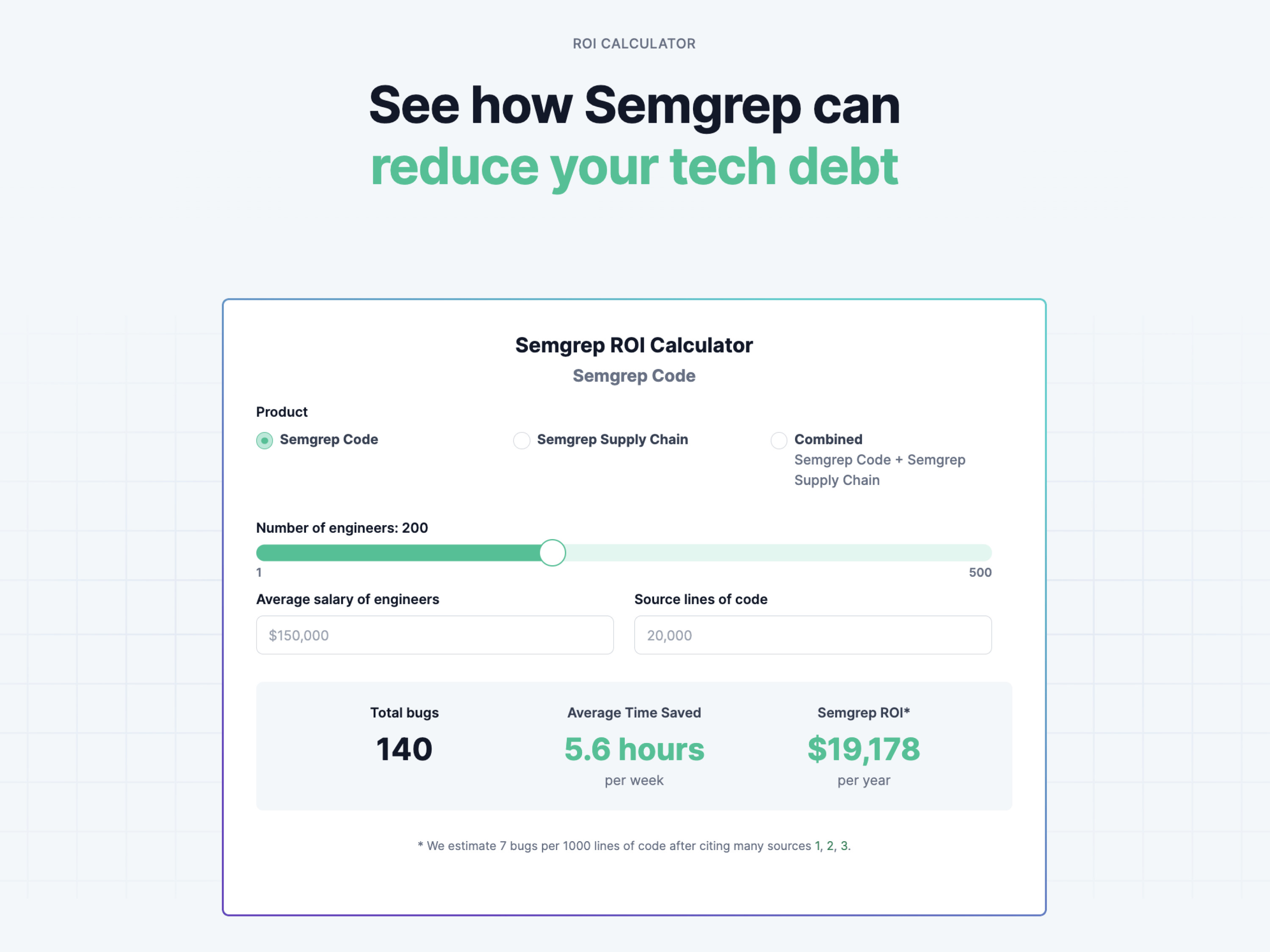 Our recommendation to Semgrep was to build an interactive ROI calculator to showcase the amount of savings Semgrep could generate in terms of coding bugs, working hours, and costs. The calculator utilizes toggles, a slider, and input fields, allowing users to generate their custom result.