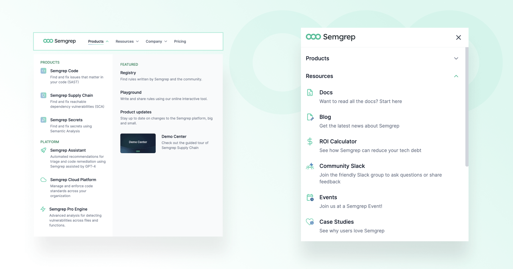 The growth of the Semgrep site also required us to work with their team to develop a new structure for the navbar and its subcategories.