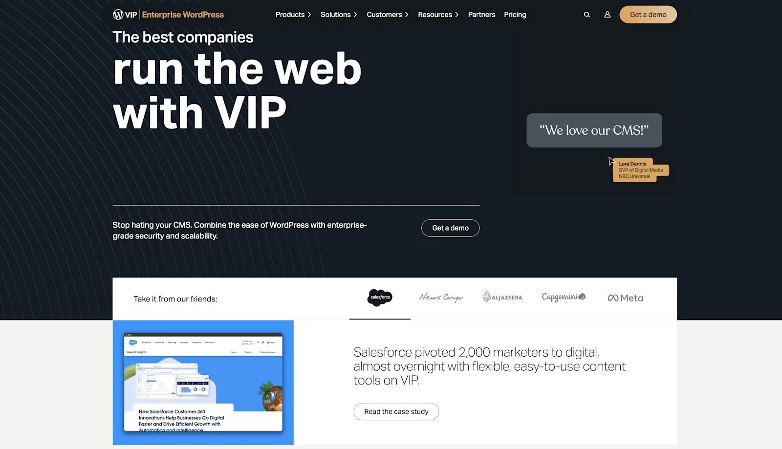WordPress VIP takes the ease and flexibility of WordPress—the CMS that runs 43% of the web—and brings it to the largest organizations. The platform is built to meet the scalability challenges of the biggest media properties, the security requirements of major government agencies, and the implementation needs of the most sophisticated enterprise companies. WordPress VIP turbocharges content velocity and provides a foundation of data to understand and improve experiences.