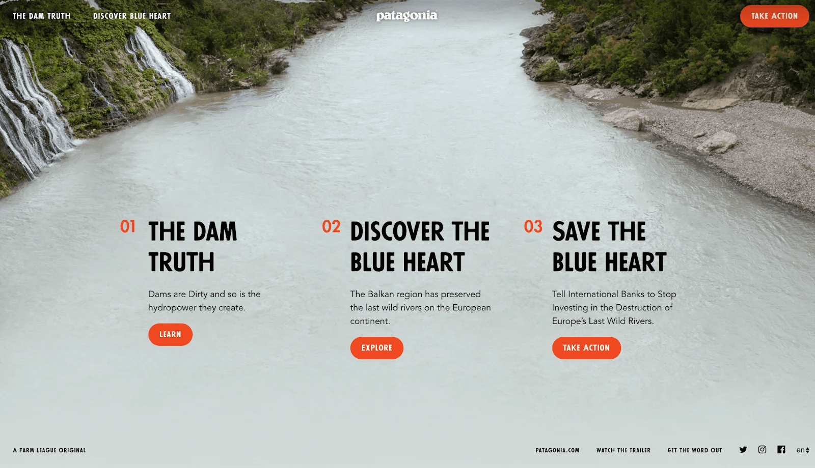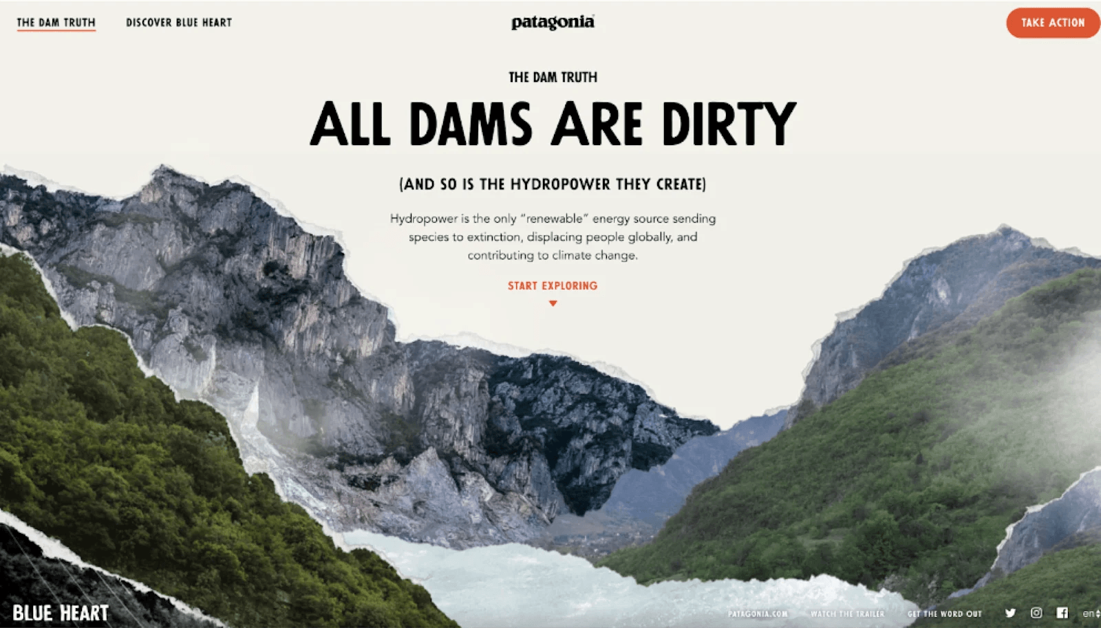 Patagonia’s team incorporates bold headlines intended to trigger the emotions of website visitors. Paired with the headlines are eye-catching experiences - in the example above, visitors can see the areas impacted by hydropower.