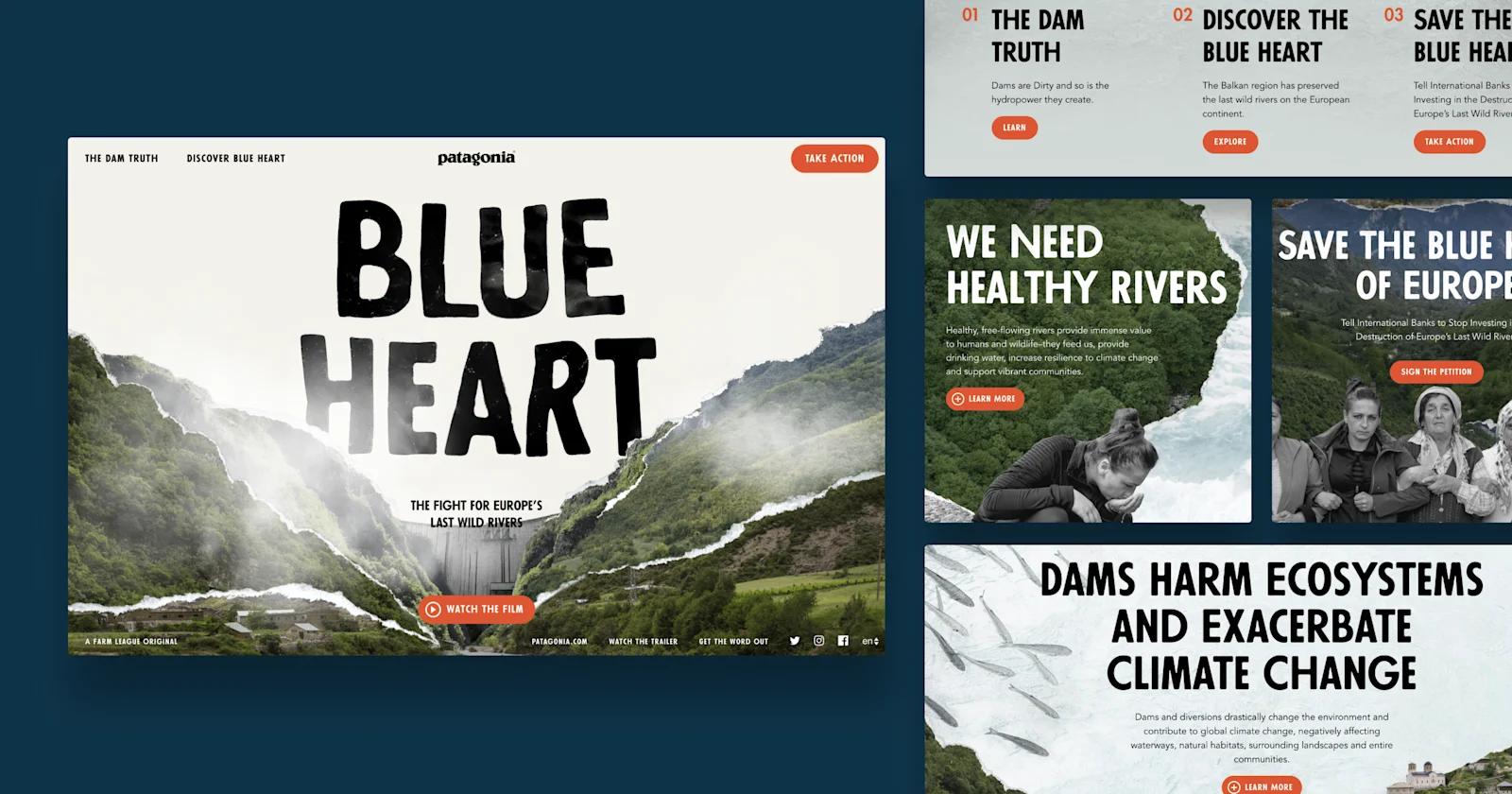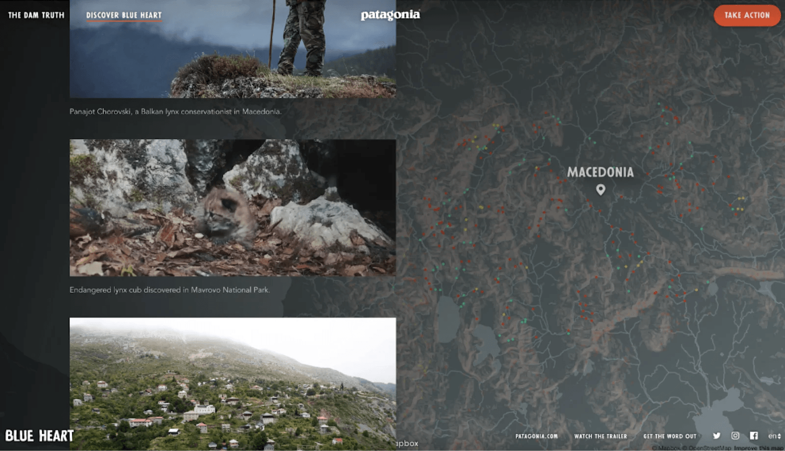 Patagonia does a great job of featuring screenshots of the European rivers and mountain ranges across the microsite. Composed of only three pages, each is designed to help raise awareness for how hydropower is impacting life across the Balkans.