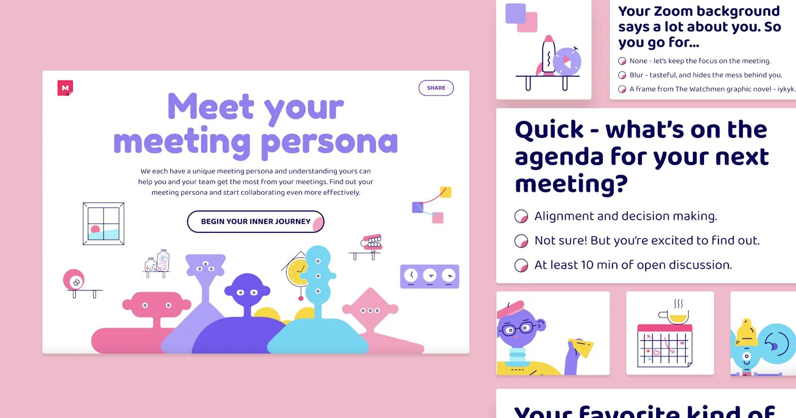 Mural asks questions about agenda organization, the types of meetings we enjoy, and even hypothetical situations like not paying attention and how we’d react. The microsite is an enjoyable experience for users to understand what they’re like as meeting participants.