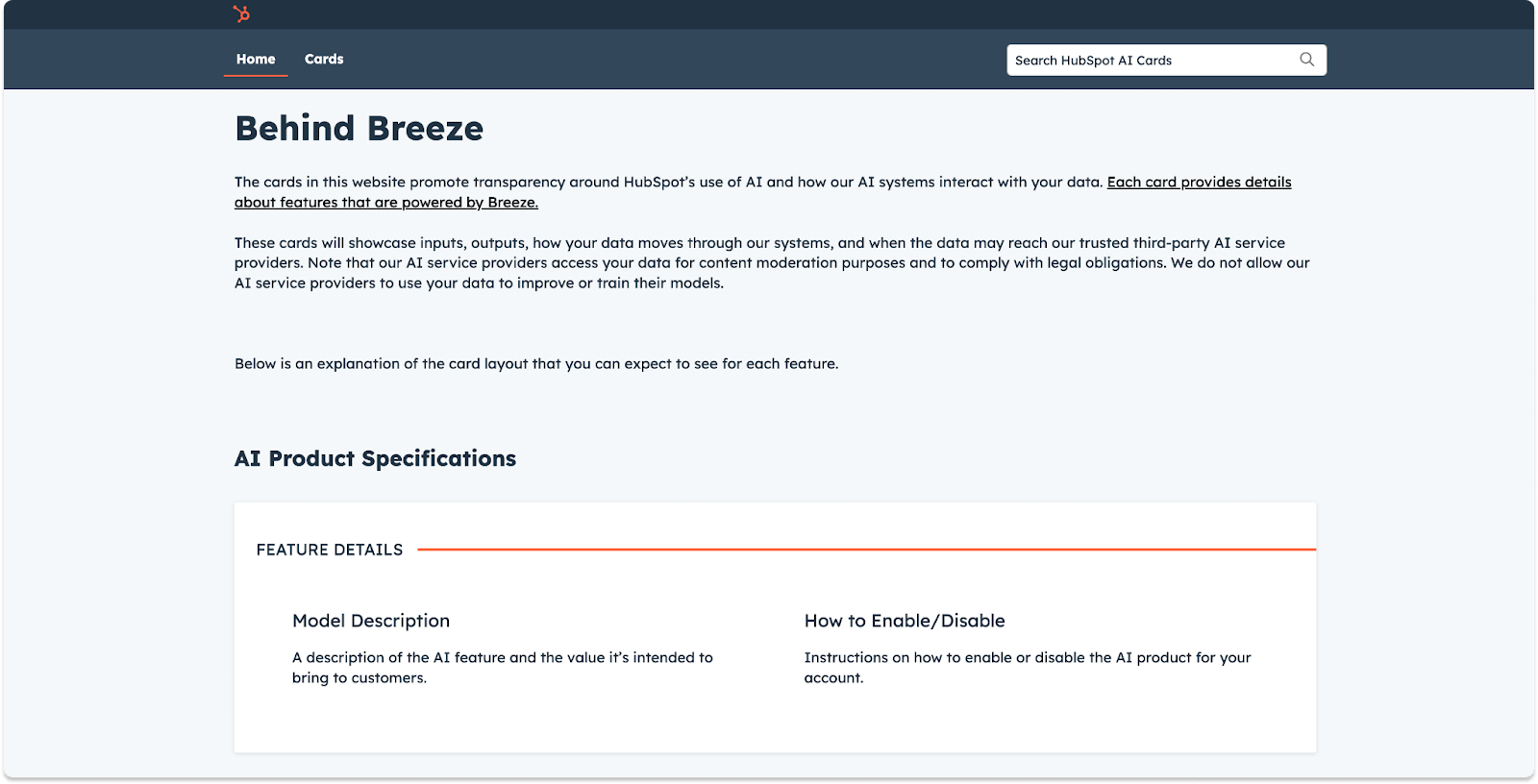 In April of 2024, HubSpot launched its new microsite, behindhubspotai.com. HubSpot's transparency hub breaks down exactly how their AI-powered tools work, with a user-friendly interface that feels approachable and easy to navigate.