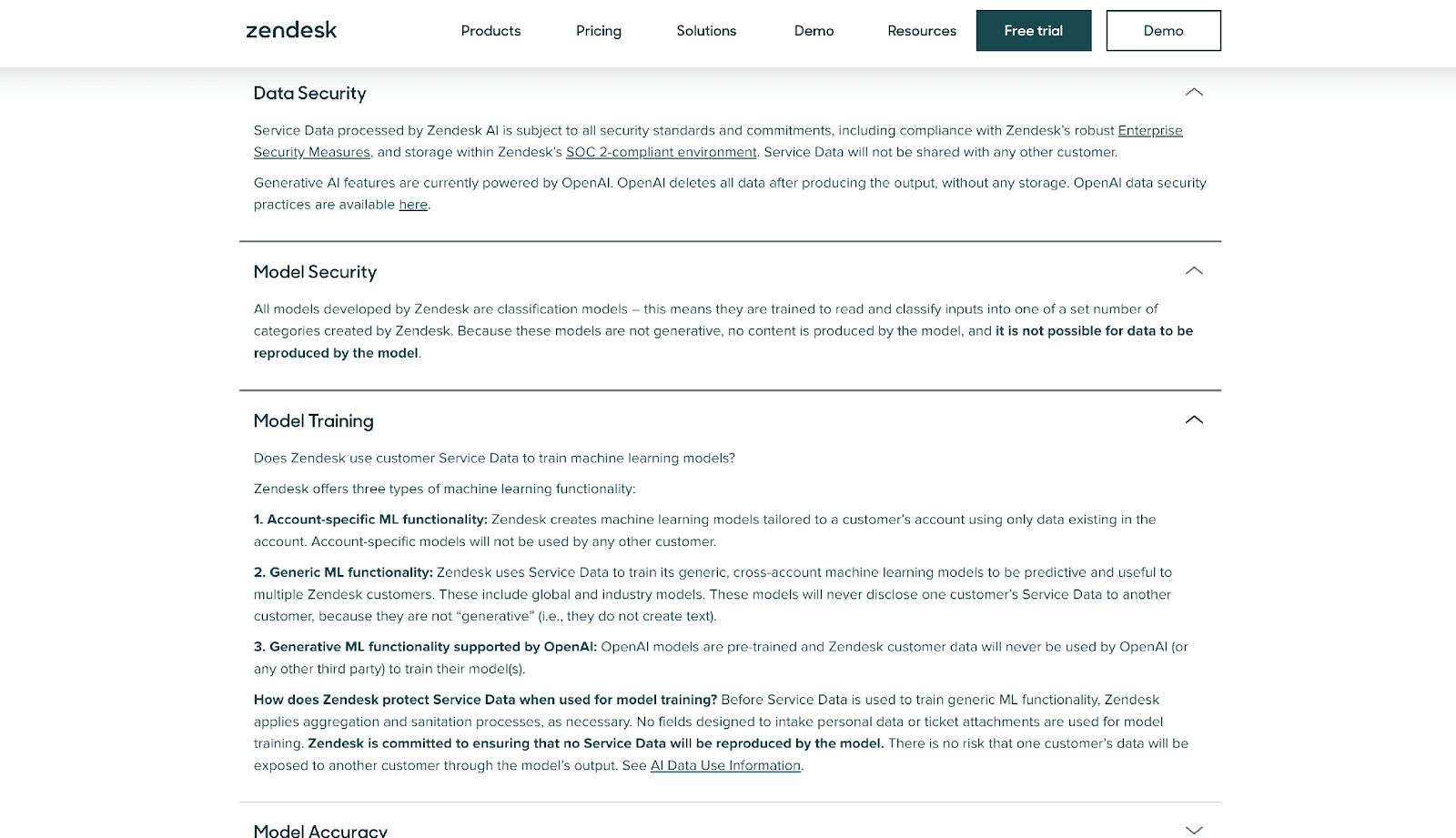 Transparency is central to Zendesk’s approach, and its Trust Center is a prime example of its commitment to openness. The Trust Center likely started as a hub for security, privacy, and legal content and evolved to showcase Zendesk’s AI capabilities.