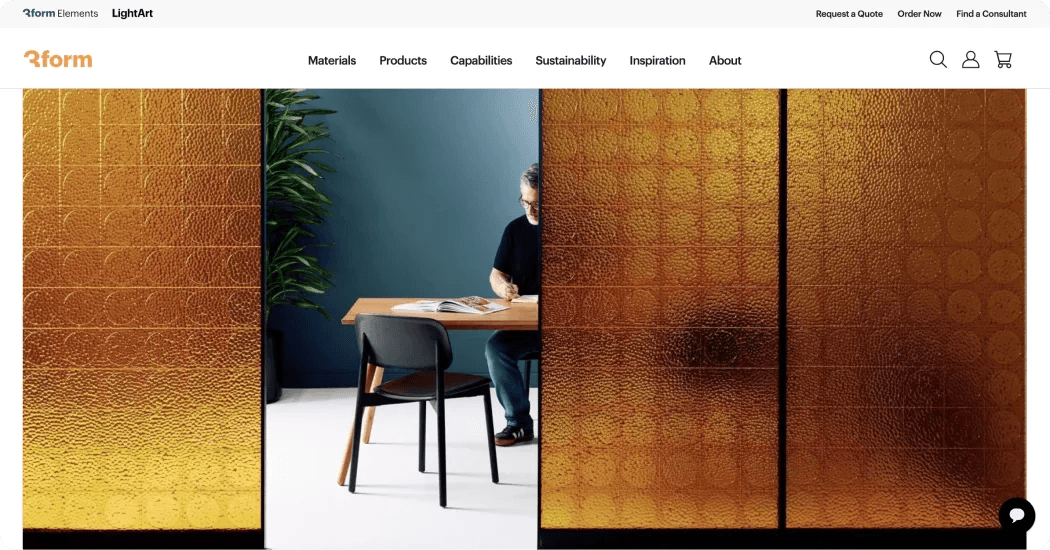 3form’s website showcases its focus on sustainable and innovative architectural solutions. The homepage highlights key products like recycled resin panels, partitions, and acoustic solutions, paired with a sleek and modern layout.