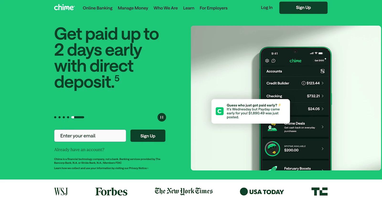 Key CTAs, like "Learn More" and "Get Started," are strategically placed to drive action, with a focus on benefits like cash advances, early paydays, and better credit tools.