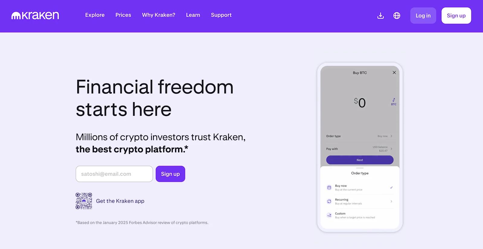 Kraken’s website delivers a modern, tech-savvy design with purple highlights, reflecting its focus on advanced crypto trading. The layout emphasizes key offerings like staking, margin trading, and rewards, with CTAs like “Sign Up” and “Buy crypto” prominently displayed.