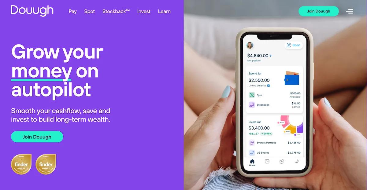 Douugh’s homepage reflects a modern, innovative design with a clean white background and purple and green accents, aligning with its mission to simplify money management. Key CTAs “Join Douugh” and “Explore Spot Jar” are strategically positioned to encourage users to explore features like Spend Jars and automated financial tools.