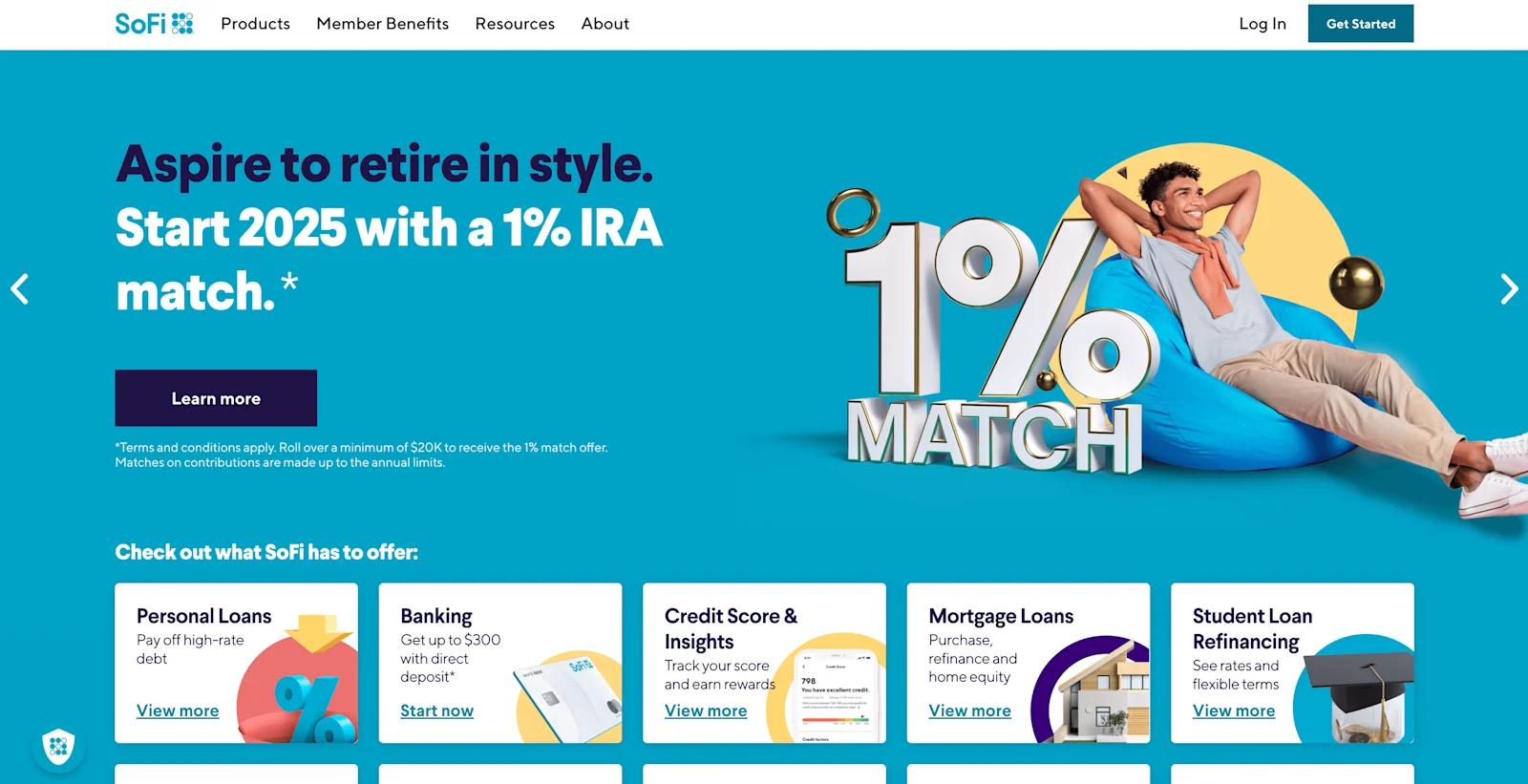 Prominent CTAs “Get Started” and “View your rate” guide users toward exploring SoFi’s financial products. Well-structured sections focus on benefits such as zero fees, cashback rewards, and member perks, while high-quality visuals and concise headlines enhance user engagement.