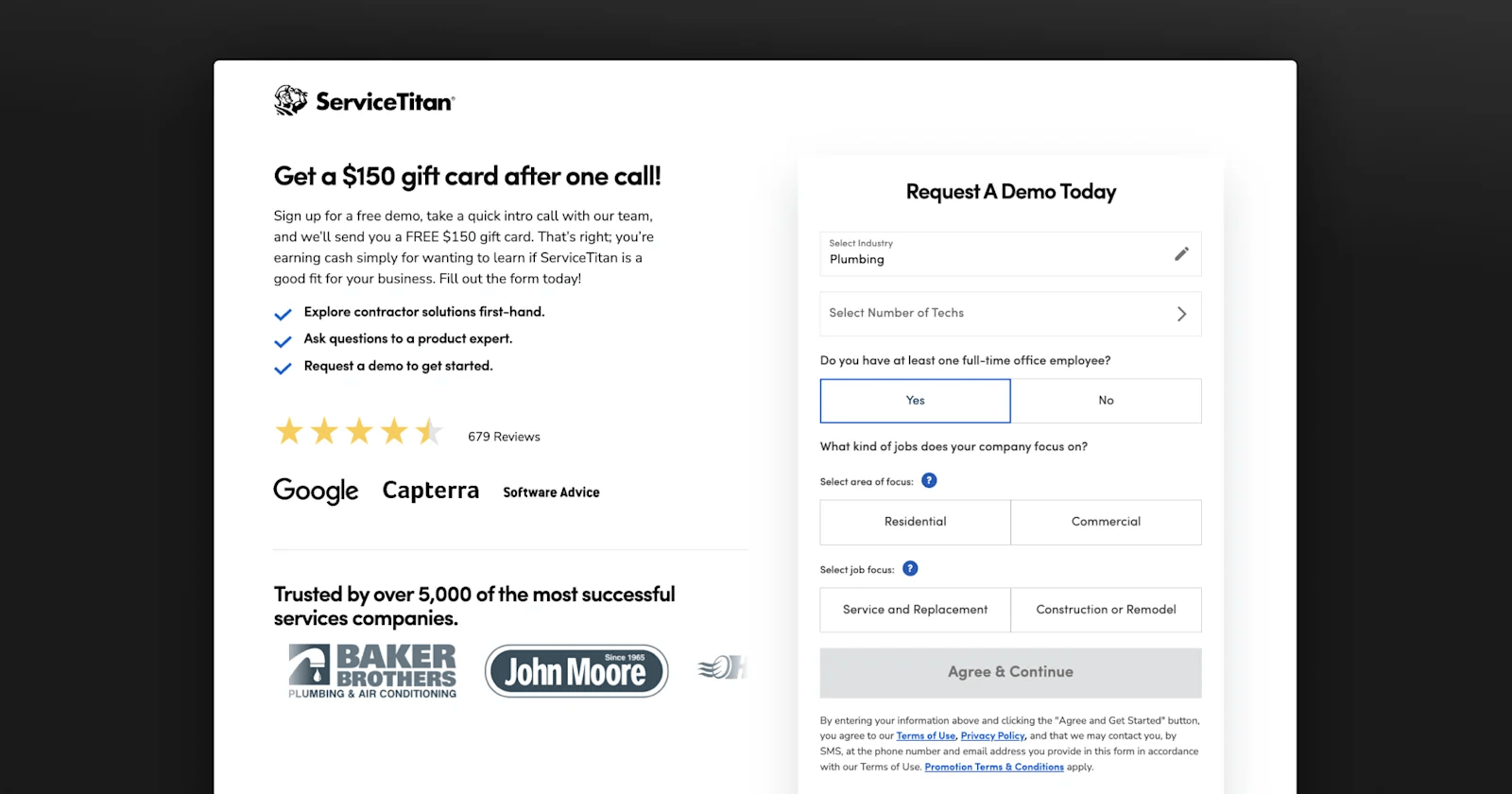 Did someone say free gift card? ServiceTitan’s demo request is a perfect example of an incentivized demo landing page. The experience exemplifies user-centric design with thoughtful features. The form uses progressive disclosure to present relevant fields based on user input, preventing overwhelm – and the user knows what they will get in return after attending the meeting.