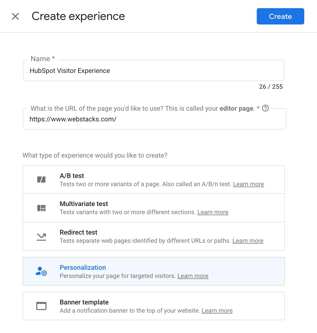 - Google Optimize – Google Optimize will serve as our personalization platform that allows our marketing team to create personalized experiences for our visitors.