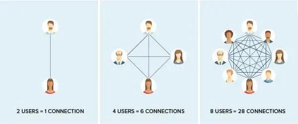 For example, a network with five nodes has a value of 25 (5x5), but a network with ten nodes has a value of 100 (10x10). By doubling the size of the network, the network's value has quadrupled.
