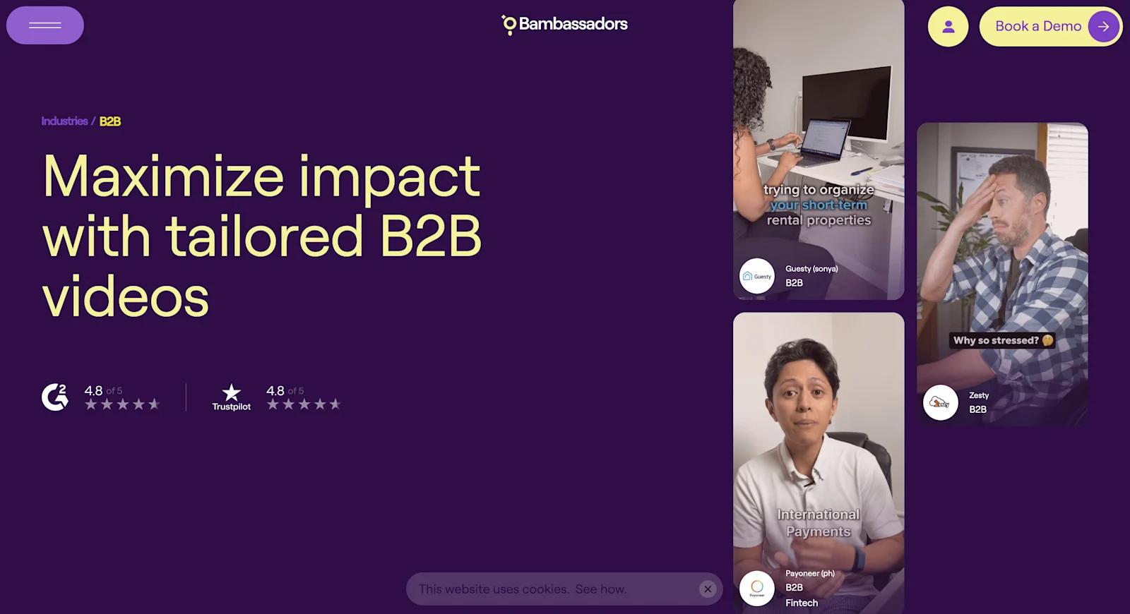 Bambassador’s B2B industry page emphasizes its video marketing expertise tailored for B2B brands. The page opens with a bold headline and rotating hero visuals showcasing real creators and impactful campaigns. The content structure balances credibility and product offerings, highlighting why top B2B brands trust Bambassador.