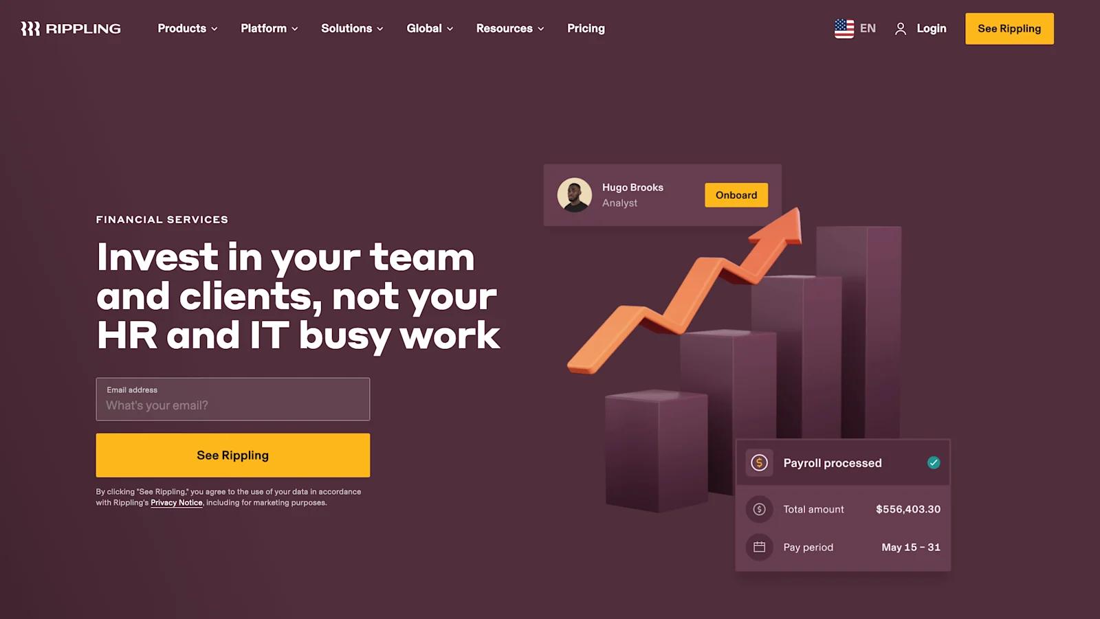Rippling’s industry page targets financial services firms by promoting streamlined HR, payroll, and IT solutions. It highlights the ability to effortlessly onboard, pay, and manage employees, reducing administrative workload and increasing operational efficiency.