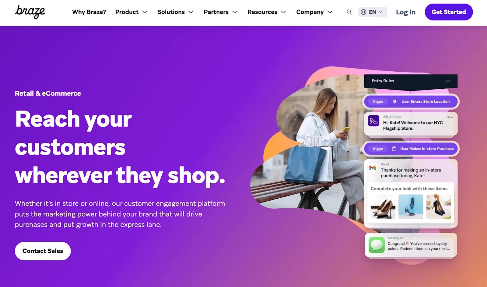 Braze’s retail and eCommerce industry page emphasizes customer engagement through personalized shopping experiences and data integration. The page highlights how brands can leverage purchase data to create custom experiences and improve marketing effectiveness.