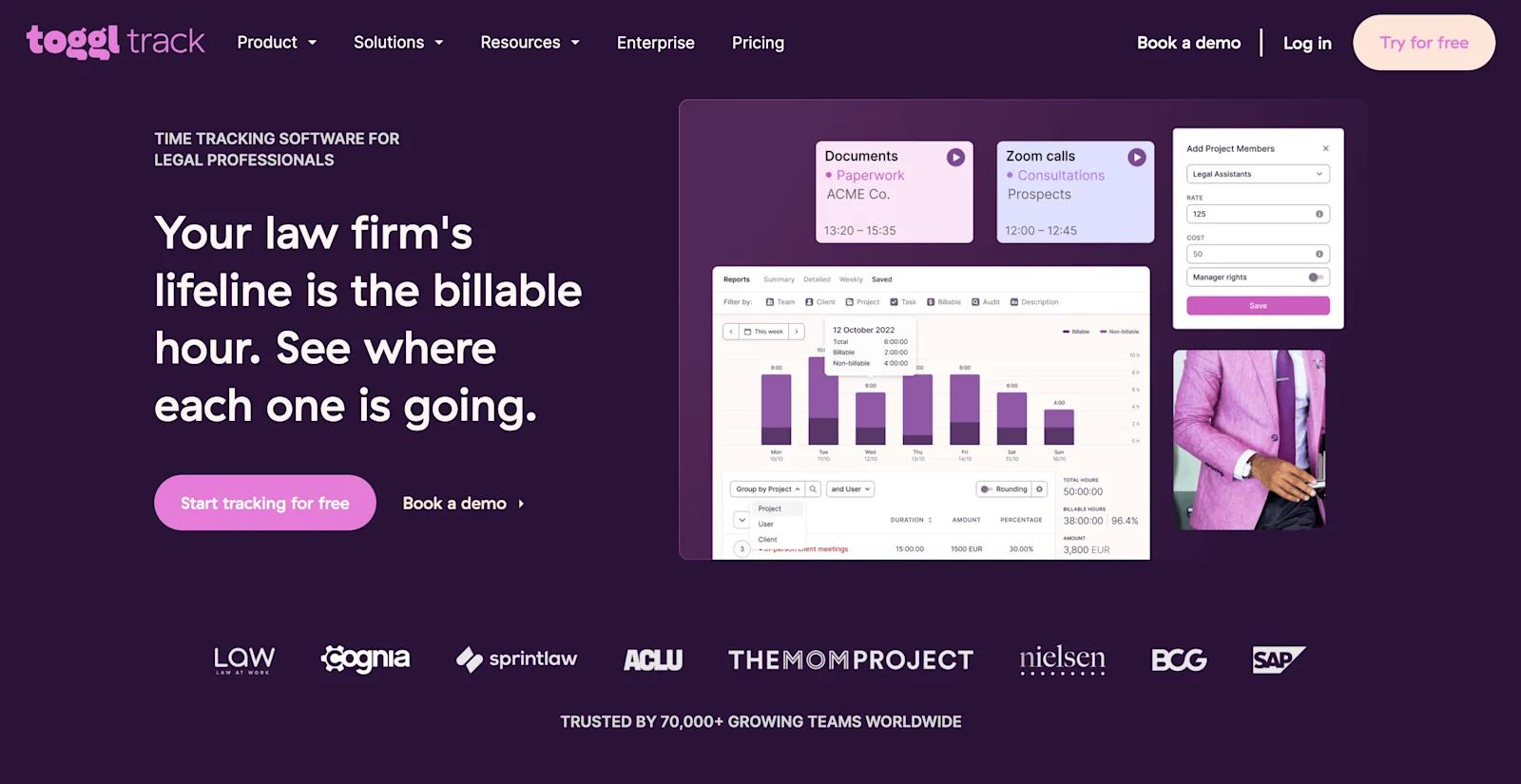 Toggl's industry page for law firms communicates how its time-tracking software streamlines operations for legal professionals. The headline immediately ties into the importance of billable hours, supported by visuals of reports and dashboards.