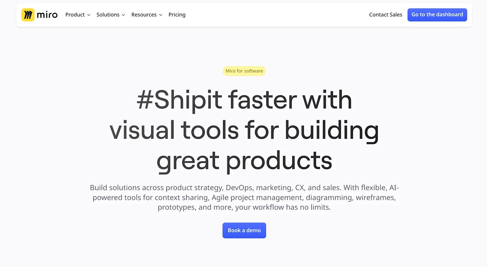 Miro's SaaS industry page focuses on accelerating product development cycles through visual collaboration tools. The page presents a clean, structured design with product screenshots that demonstrate use cases like roadmaps, backlogs, and wireframes.