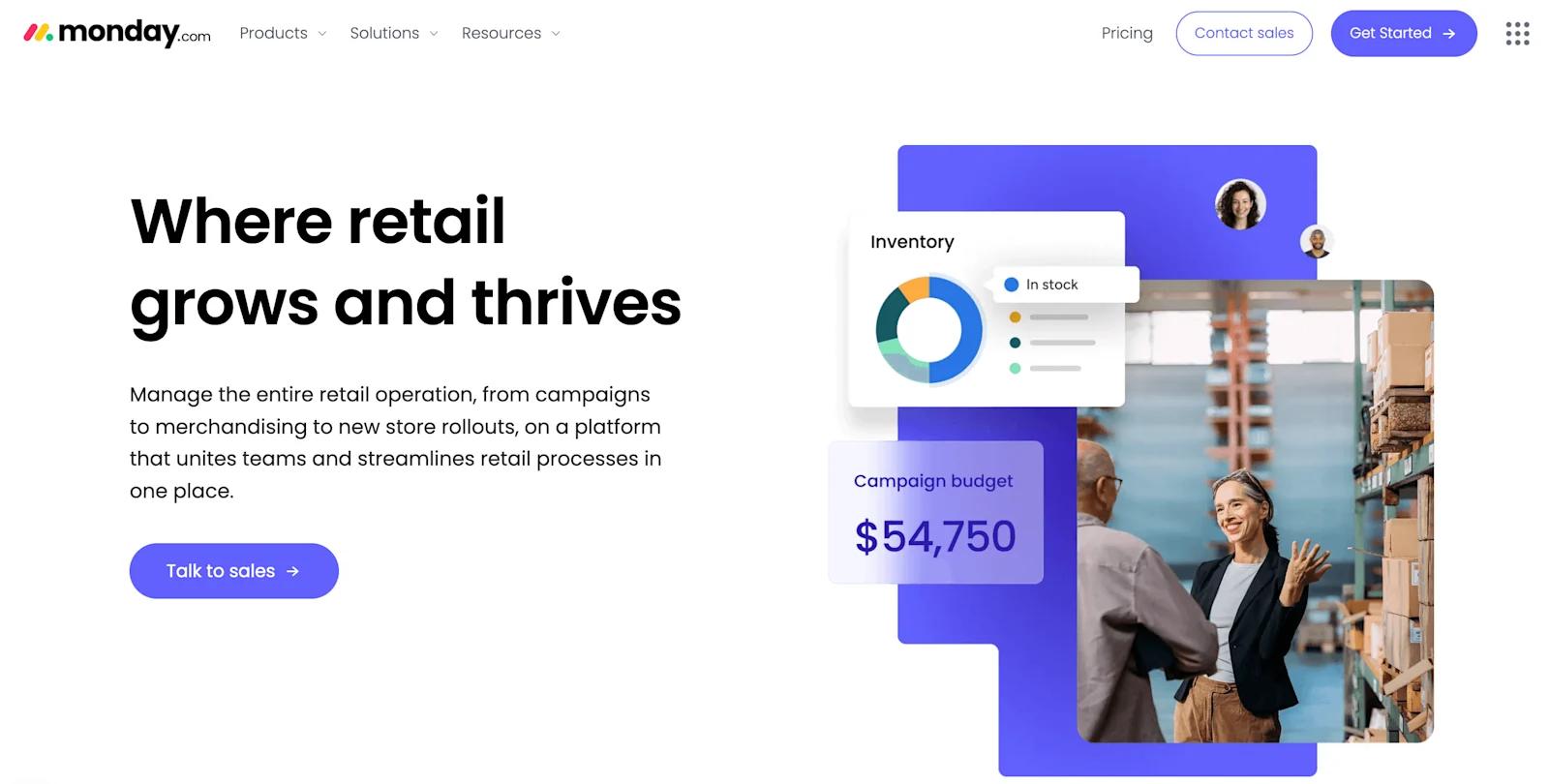 Monday.com’s industry page for retail highlights how its platform improves collaboration and operational efficiency across key teams such as product, marketing, and operations. The messaging focuses on streamlining communication, boosting visibility into workflows, and accelerating time-to-market.