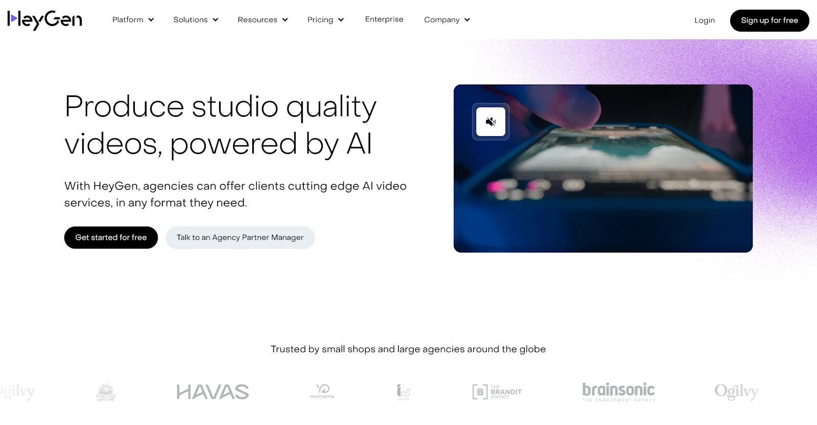 Heygen's industry page for agencies highlights how AI can transform video production by delivering studio-quality results quickly and affordably. The design uses a blend of gradient visuals and video previews to immediately catch the user's attention.