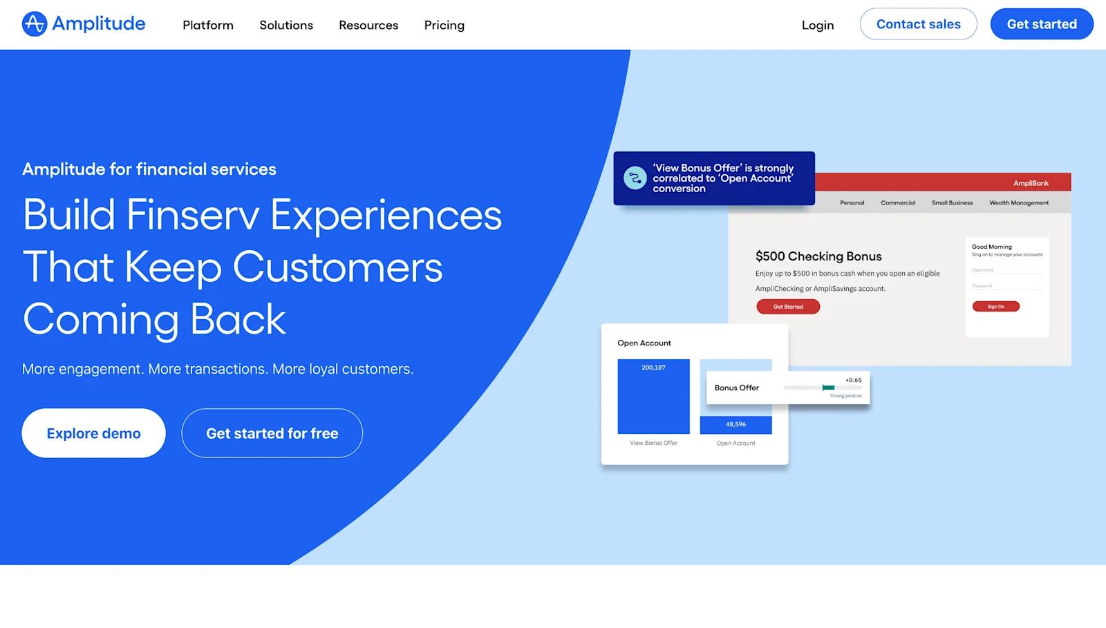 Amplitude’s page for financial services promotes a data-driven approach to improving digital customer experiences. The focus is on unifying banking platforms and using advanced analytics to map customer journeys, reduce churn, and optimize engagement.