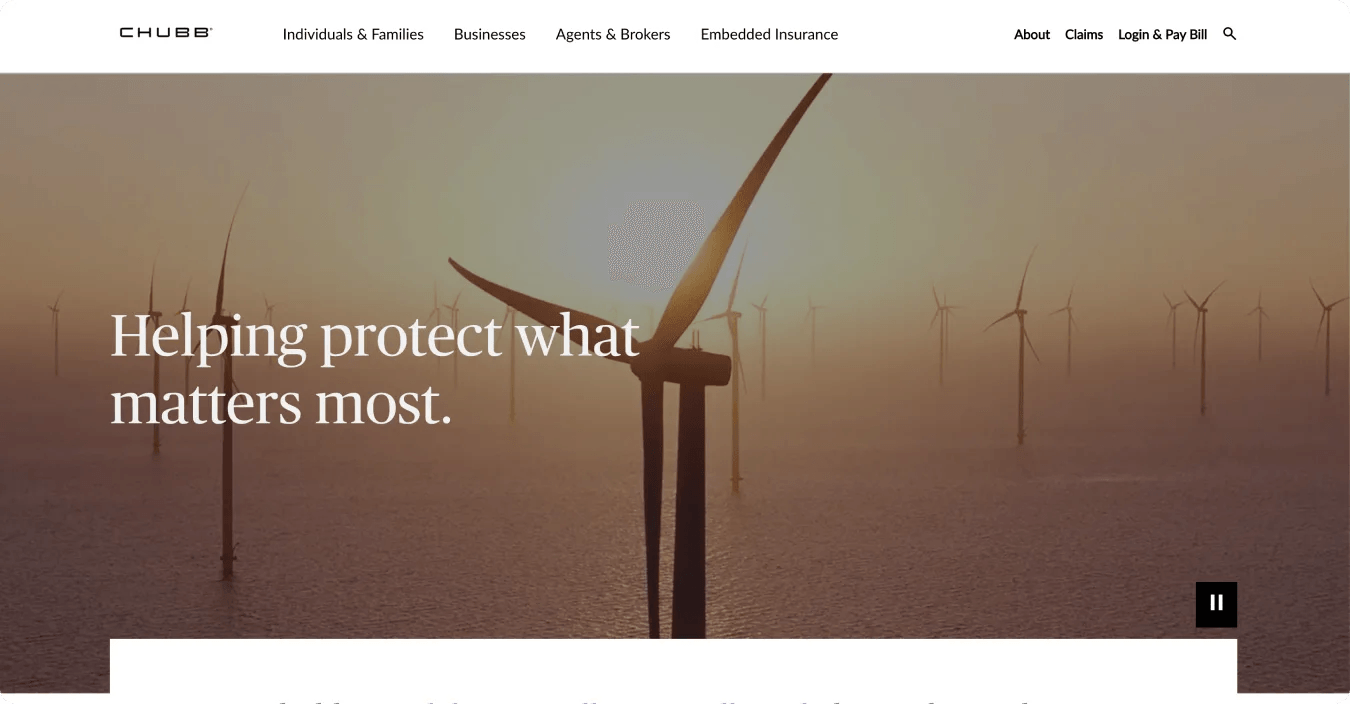 Chubb's website offers a sleek, professional design that prioritizes user functionality and accessibility. The homepage grabs user attention with a high-quality video and features streamlined navigation to core sections like "Individuals & Families" and "Businesses." The site integrates interactive tools like claims reporting, along with the Chubb Studio platform for embedding insurance solutions into partner ecosystems.