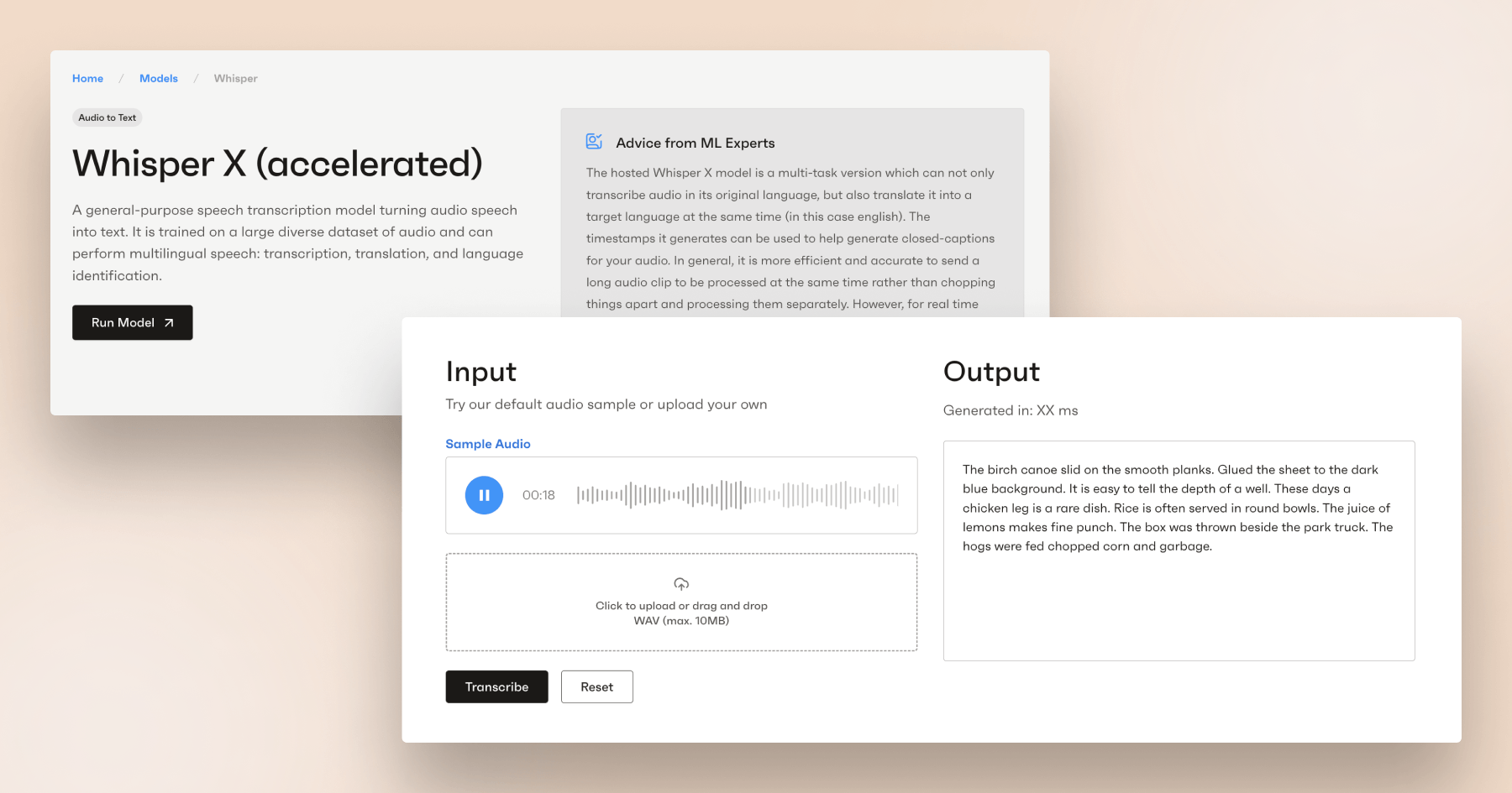 Whisper is an audio-to-text transcription model that can perform multilingual speech, translation, and language identification. A sample clip is provided in the demo, but users can also seamlessly upload their own files for transcription by the OctoML model.